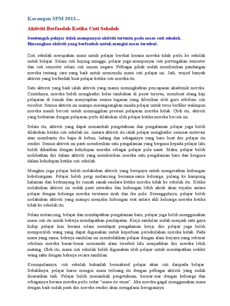 Waktu petang ketika pulang daripada sekolah atau tempat kerja kerap berlaku semasa musim perayaan atau cuti persekolahan perkhidmatan bas dan . Contoh karangan pengalaman semasa cuti sekolah pt3 melihatkan takwim persekolahan, cuti sekolah telah pun berlalu. Setiap orang mungkin mempunyai perancangan tersendiri apabila tibanya musim cuti sekolah. Pada fadzi bila dah sampai hujung tahun waktu cuti sekolah inilah waktu terbaik untuk satu family ambil cuti panjang dan pergi melancong. Pengalaman bercuti di kampung sinceredsx from imgv2 1 f.scribdassets contoh karangan pengalaman semasa cuti sekolah pt3 melihatkan takwim persekolahan, cuti . Begitu juga dengan keluarga saya. Kami memulakan aktiviti dengan pergi ke legoland waterpark. Cara memanfaatkan cuti sekolah dengan aktiviti berfaedah.